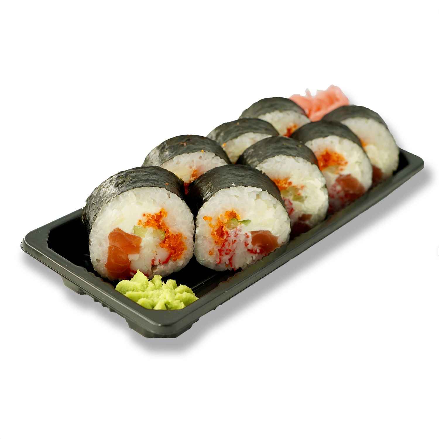 Сьомга слабосолена, ролца от раци, ориз, крема сирене Philadelphia, хайвер Тобико, краставица, нори листа. Уасаби, джинджифил маринован, соев сос Kikkoman.