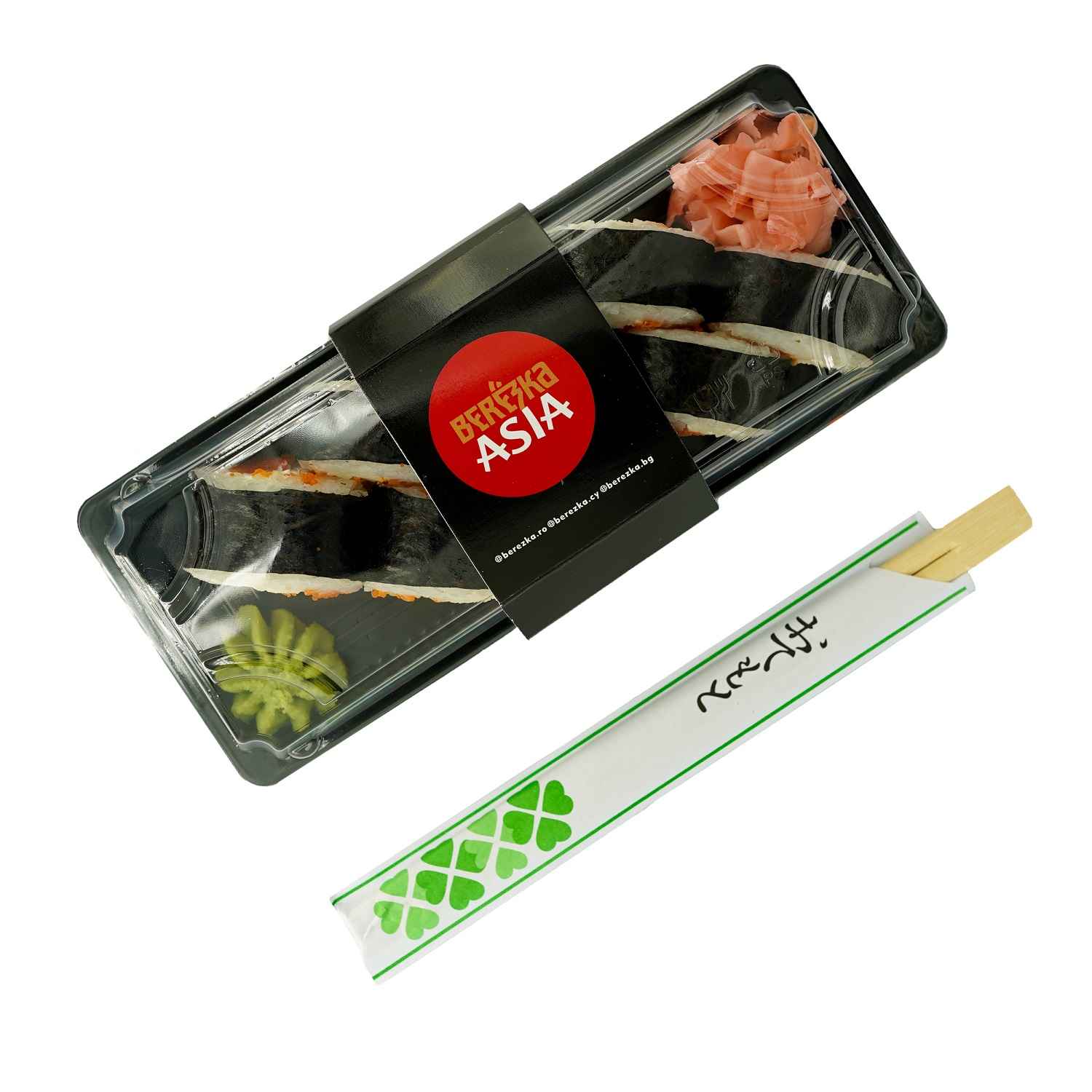 Всяка порция суши включва клечки, 10 гр. уасаби, 15гр. джинджифил, 10 мл. соев сос.