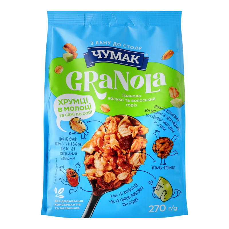 Изпечена смес 89 % (пълнозърнести ОВЕСЕНИ ядки 53,4 %, захар, царевични люспи (царевична крупа, захар, ЕЧЕМИЧНО-МАЛЦОВ екстракт, сол), палмов олеин, кокосови стърготини, оризови зърна (оризово брашно, ПШЕНИЧНО брашно, захар, сол, набухвател: натриев хидрогенкарбонат), ПШЕНИЧНО брашно, натурален мед 1,99 %, глюкоза, сол); плънка в променливо съотношение 11 % (стафиди (сушено грозде), сушена ябълка 2 %, ядка от ОРЕХ 2 %).