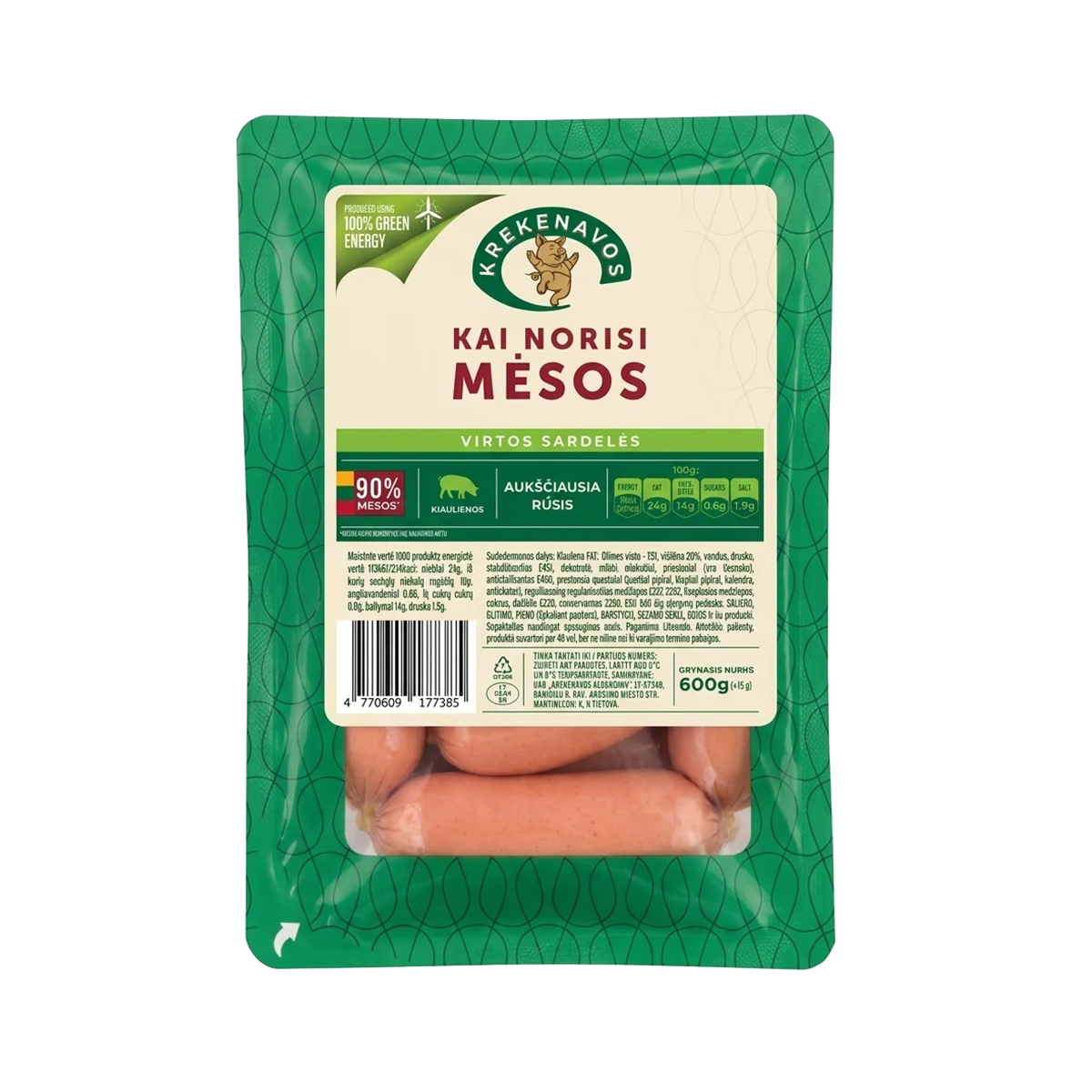Cвинско месо 70 % (място на произход – ЕС), пилешко месо 20 %, вода, сол, стабилизатор E451, декстроза, екстракти от мая, подправки (чесън), антиоксидант E300, екстракти от подправки (черен пипер, бахар, кориандър, индийско орехче), захар, оцветител E120, консервант E250. Може да съдържа следи от: ЦЕЛИНА, МЛЯКО (включително ЛАКТОЗА), ГЛУТЕН, СИНАП, СУСАМ, СОЯ.