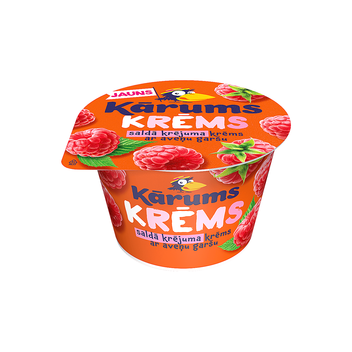 Съставки: КРАВЕ МЛЯКО, сметана 18%, захар, вода, обезмаслено КРАВЕ МЛЯКО на прах, желатин, модифицирано нишесте, стабилизатори: карагенан, моно- и диглицериди на мастни киселини; натурален ароматизант (малина), концентрати: сладък картоф, морков; ароматизант ванилин. Условия на съхранение: съхранявайте при температура от +2 °C до +6 °C. След отваряне не съхранявайте. Най-добър до: виж на опаковката. Хранителна стойност на 100 g продукт: енергийна стойност 748 kJ/ 178 kcal, мазнини 8,2 g, от които наситени мастни киселини 5,6 g, въглехидрати 21,4 g, от които захари 19,0 g, белтъци 4,7 g, сол 0,15 g. Производител: AS „Rīgas piena kombināts”, Латвия. Вносител: Берьозка Трейдинг ЕООД, с.Бенковски, област г. Варна, България, тел.+359877666296; www.berezka.bg.