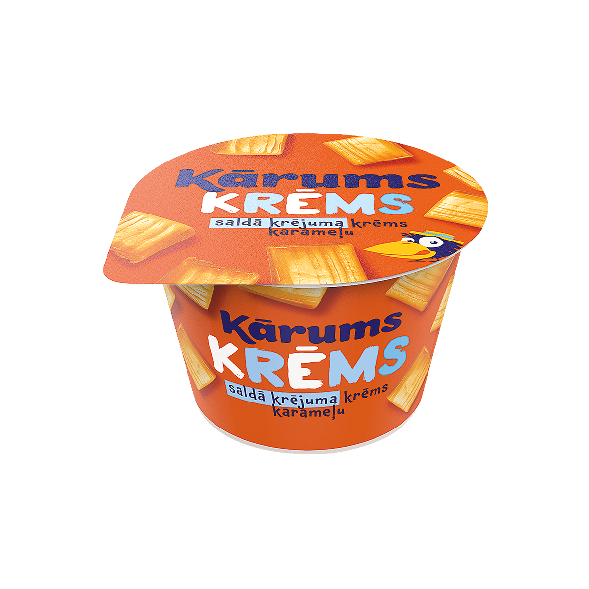 КРАВЕ МЛЯКО, СМЕТАНА 18%, захар, вода, обезмаслено КРАВЕ МЛЯКО на прах, желатин, модифицирано нишесте, стабилизатори: карагенан, моно- и диглицериди на мастни киселини; ароматизант карамел, оцветител амонячен карамел.